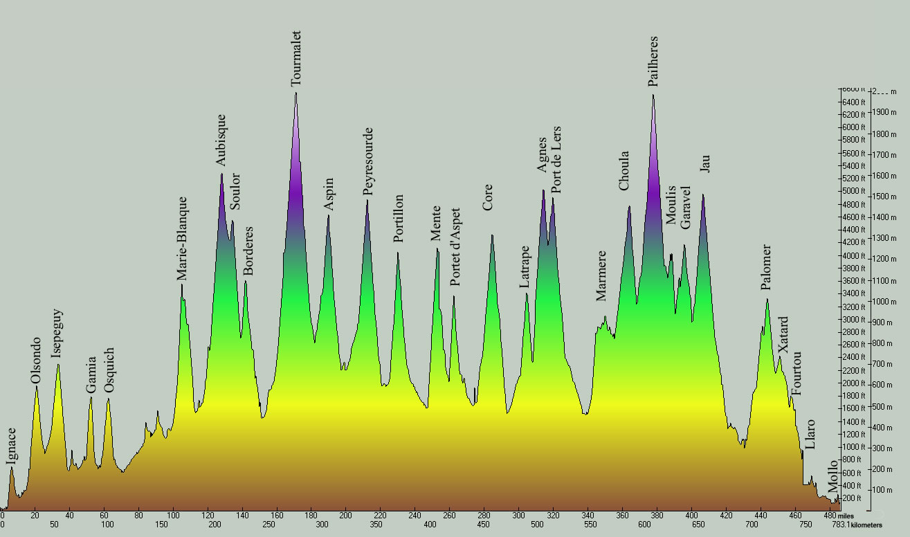 Spain and France TripGPS InformationKenny recorded the bike portion of our trip on GPS. Here is the entire GPS track in .gpx format. After clicking the link you might need to choose File...Save As in order to save the file to your computer. it. You will need some sort of GPS software to view it. You can also open it using Google Earth, but you will need to download the file first, and then open it from within Google Earth. Select File..Open..Files of Type...Gps in order to open a .gpx file. Here is a graphic of the elevation profile from the GPS track. Click on the image to see a larger version. If you are familiar with Google Earth, here is a Google Earth file that you can open and view lots of details in 3D. Again after clicking the link you might need to choose File...Save As in order to save the file to your computer. If you don't have GPS software, you can also view the route using the following Google Map. Click the link below the map to open a larger version of the map on it's own page If you have Google Earth or a willing to download and install it, the coolest thing is to view the information in this.kml file. PyreneesRaid.kml |